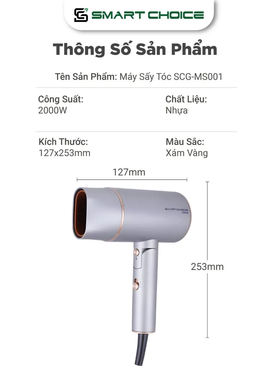Chào mừng bạn đến với giải pháp chăm sóc tóc đẳng cấp! Máy sấy tóc SmartChoice SCG-MS001 mang đến công suất mạnh mẽ và sự tiện lợi vượt trội cho việc tạo kiểu tóc. Dưới đây là lý do tại sao bạn sẽ yêu thích sản phẩm này: