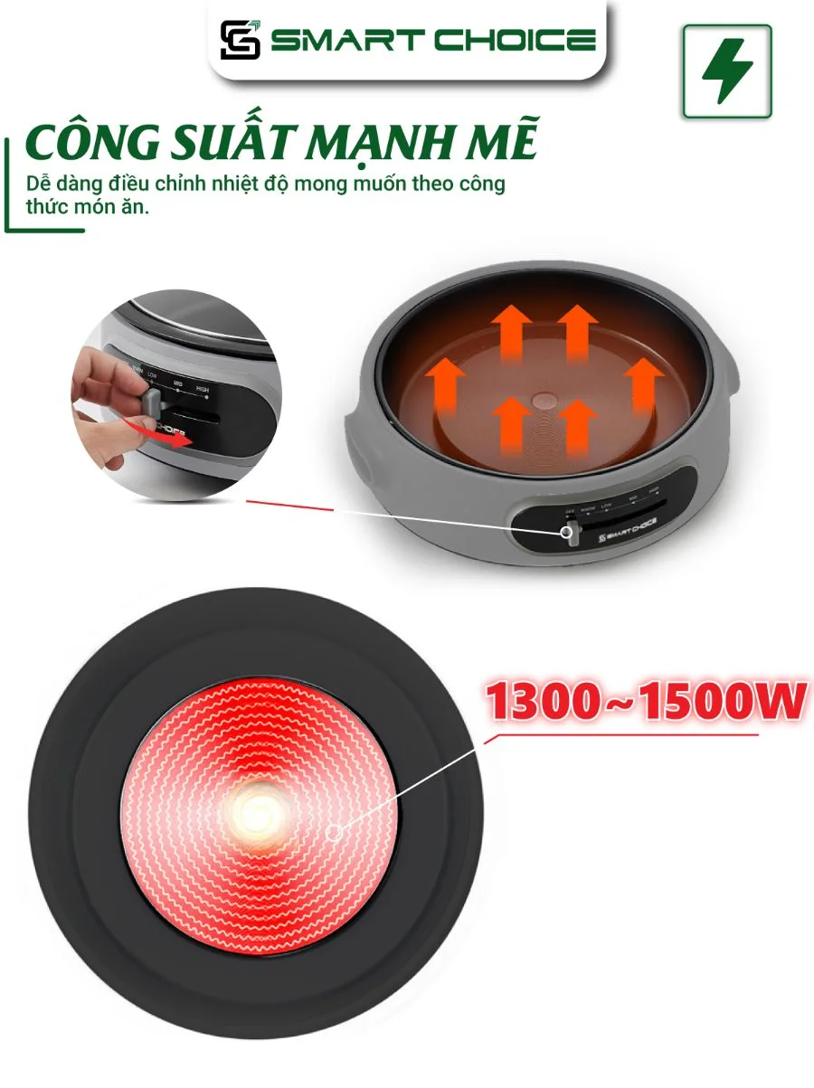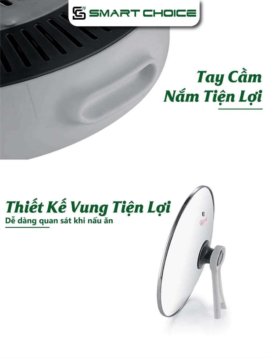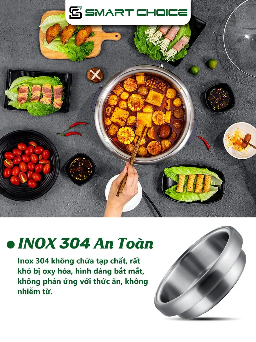 - Dung tích lớn, an toàn cho sức khỏe: Với dung tích 4L và chất liệu inox 304 cao cấp, nồi lẩu nướng SmartChoice đảm bảo an toàn tuyệt đối, không chứa PFOA và các chất gây hại khác, không phơi nhiễm thực phẩm dù ở nhiệt độ cao.