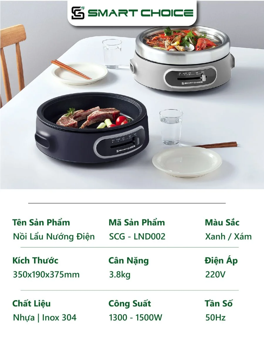 Nồi lẩu nướng điện SmartChoice SCG-LND002 mang đến sự tiện lợi với thiết kế nhỏ gọn, tinh tế và an toàn. Với khả năng vừa nướng vừa lẩu, sản phẩm này là lựa chọn hoàn hảo cho mọi gia đình.