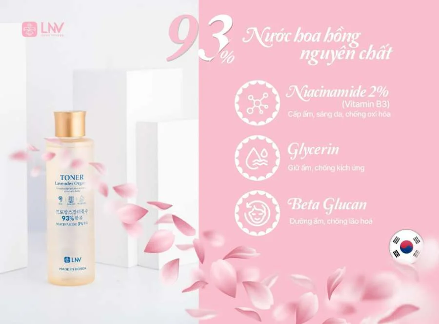 Với sự kết hợp độc đáo của nước chưng cất hoa hồng, Niacinamide, Glycerin, và Beta-Glucan, sản phẩm chăm sóc da của chúng tôi mang lại những lợi ích tuyệt vời cho làn da của bạn. Được chiết xuất từ 28 thành phần tự nhiên như hoa Lavender, trà xanh, vỏ cây dâu tằm, chiết xuất hoa cúc và nhiều thành phần khác, sản phẩm không chỉ dưỡng ẩm sâu mà còn giúp se lỗ chân lông, ngăn ngừa mụn, và cung cấp sức sống mới cho làn da của bạn.